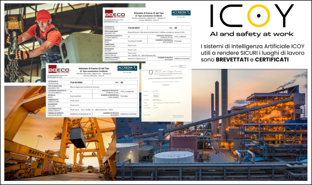 Il settore dell’Intelligenza Artificiale e delle sue applicazioni è in costante evoluzione. Ci si interroga su quali modelli utilizzare e quali siano i criteri migliori per la selezione di tali modelli. Fondamentale affidarsi a realtà che hanno brevettato e certificato i sistemi, basati su intelligenza artificiale, che propongono sul mercato e li hanno già applicati con successo in realtà importanti del panorama italiano. Il primo passo è stato quello di brevettare la nostra tecnologia ICOY Mover Crane ® Brevetto italiano N. 102020000016051. Oggi abbiamo ottenuto la Certificazione con Esame CE, secondo la Direttiva Macchine 2006/42/CE – Allegato IX, dimostra che le nostre soluzioni ICOY sono verificate secondo la procedura e sono conformi ai requisiti essenziali di sicurezza e salute, definiti della Direttiva.